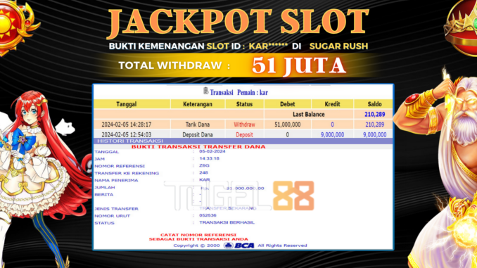 TOGEL88 mengucapkan selamat kepada user id : KAR*** yang telah berhasil mendapatkan jackpot pada permainan SLOT di SUGAR RUSH. Kemenangan sebesar Rp 51.000.000,-. telah dibayarkan LUNAS oleh pihak TOGEL88 kepada pemilik user id setelah yang bersangkutan mengisi formulir withdraw. Proses pencairan dana berlangsung sangat cepat hanya dalam waktu 5-10 menit sudah berada dalam rekening pemilik user id. Bukti transfer yang dapat anda lihat adalah bukti SAH / VALID yang langsung di dapatkan melalui bukti transaksi dari Bank yang digunakan untuk pengiriman dana pada rekening pemilik user id. Terima kasih kami sampaikan kepada para pengguna setia TOGEL88 yang telah menggunakan situs kami, sebagai Bandar Terpercaya yang pastinya membayar semua kemenangan member hingga lunas. Apakah TOGEL88 PENIPU ? Reputasi “TOGEL88 TERPERCAYA” sudah sangat melekat. puluhan hingga ratusan ribu pengguna setia TOGEL88 tetap menggunakan situs terbesar dan terbaik di Indonesia ini. Hapus rasa was-was dan khawatir anda, kemenangan anda berapapun PASTI dibayarkan hingga lunas.