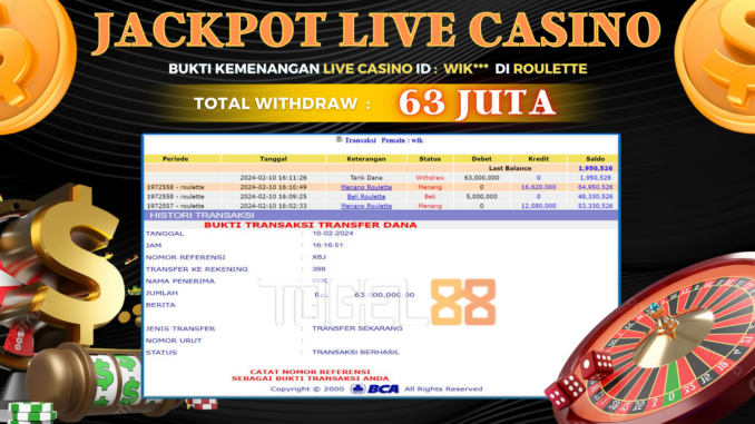 TOGEL88 JACKPOT LIVE CASINO DI ROULETTE Rp 63.000.000,- LUNAS