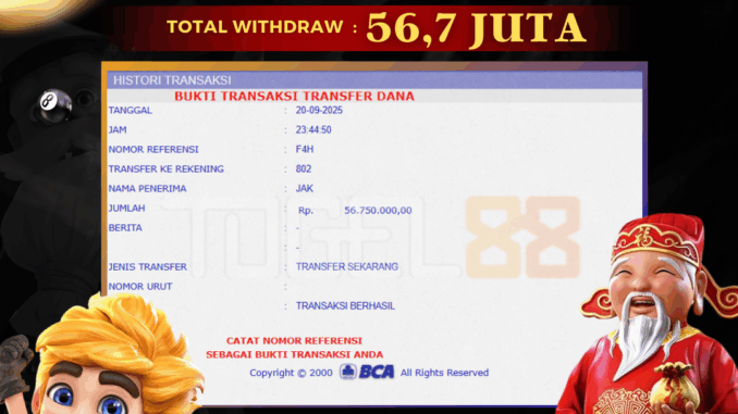 TOGEL88 mengucapkan selamat kepada user id : NET*** yang telah berhasil mendapatkan jackpot pada permainan SLOT DI THE POWER OF ODIN. Kemenangan sebesar Rp 56.700.000,-. telah dibayarkan LUNAS oleh pihak TOGEL88 kepada pemilik user id setelah yang bersangkutan mengisi formulir withdraw. Proses pencairan dana berlangsung sangat cepat hanya dalam waktu 5-10 menit sudah berada dalam rekening pemilik user id. Bukti transfer yang dapat anda lihat adalah bukti SAH / VALID yang langsung di dapatkan melalui bukti transaksi dari Bank yang digunakan untuk pengiriman dana pada rekening pemilik user id. Terima kasih kami sampaikan kepada para pengguna setia TOGEL88 yang telah menggunakan situs kami, sebagai Bandar Terpercaya yang pastinya membayar semua kemenangan member hingga lunas. Apakah TOGEL88 PENIPU ? Reputasi “TOGEL88 TERPERCAYA” sudah sangat melekat. puluhan hingga ratusan ribu pengguna setia TOGEL88 tetap menggunakan situs terbesar dan terbaik di Indonesia ini. Hapus rasa was-was dan khawatir anda, kemenangan anda berapapun PASTI dibayarkan hingga lunas.