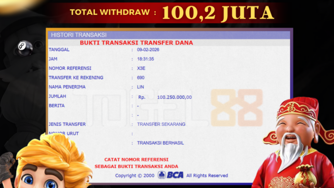 TOGEL88 mengucapkan selamat kepada user id : LIN*** yang telah berhasil mendapatkan jackpot pada permainan SLOT DI PYRAMID BONANZA . Kemenangan sebesar Rp 100.250.000,-. telah dibayarkan LUNAS oleh pihak TOGEL88 kepada pemilik user id setelah yang bersangkutan mengisi formulir withdraw. Proses pencairan dana berlangsung sangat cepat hanya dalam waktu 5-10 menit sudah berada dalam rekening pemilik user id. Bukti transfer yang dapat anda lihat adalah bukti SAH / VALID yang langsung di dapatkan melalui bukti transaksi dari Bank yang digunakan untuk pengiriman dana pada rekening pemilik user id. Terima kasih kami sampaikan kepada para pengguna setia TOGEL88 yang telah menggunakan situs kami, sebagai Bandar Terpercaya yang pastinya membayar semua kemenangan member hingga lunas. Apakah TOGEL88 PENIPU ? Reputasi “TOGEL88 TERPERCAYA” sudah sangat melekat. puluhan hingga ratusan ribu pengguna setia TOGEL88 tetap menggunakan situs terbesar dan terbaik di Indonesia ini. Hapus rasa was-was dan khawatir anda, kemenangan anda berapapun PASTI dibayarkan hingga lunas.