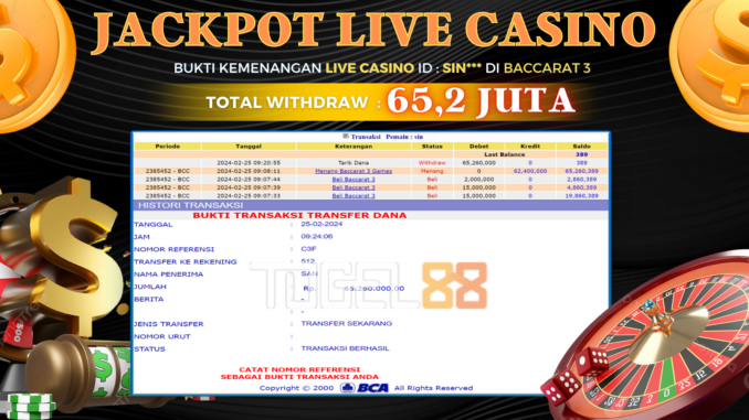 TOGEL88 JACKPOT LIVE CASINO DI BACCARAT 3 Rp 65.260.000,- LUNAS