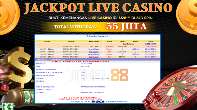 TOGEL88 JACKPOT LIVE CASINO DI 24D SPIN Rp 55.000.000,- LUNAS