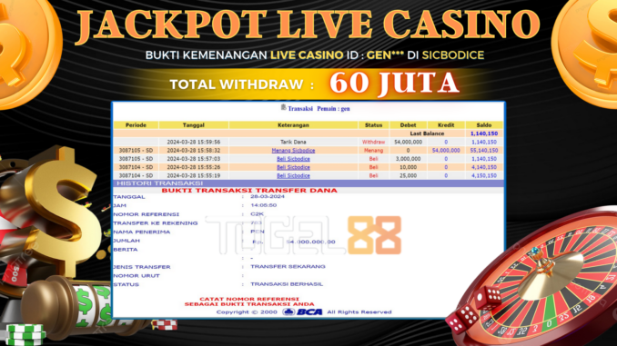 MEMBER TOGEL88 MENERIMA PELUNASAN KEMENANGAN JACKPOT LIVE CASINO DI SIBCBODICE Rp 60.000.000,- LUNAS