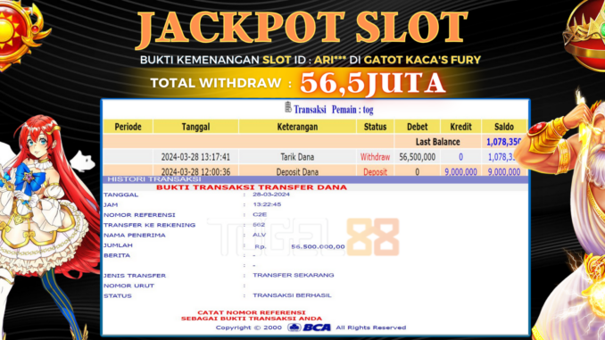 MEMBER TOGEL88 MENERIMA PELUNASAN KEMENANGAN JACKPOT SLOT DI GATOT KACA’S FURY Rp 56.500.000,- LUNAS
