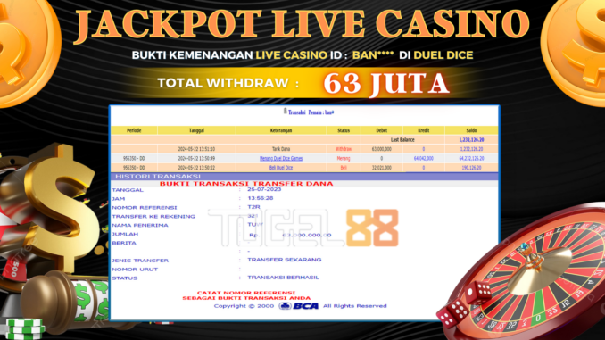 TOGEL88 JACKPOT LIVE CASINO DI DUEL DICE Rp 63.000.000,- LUNAS