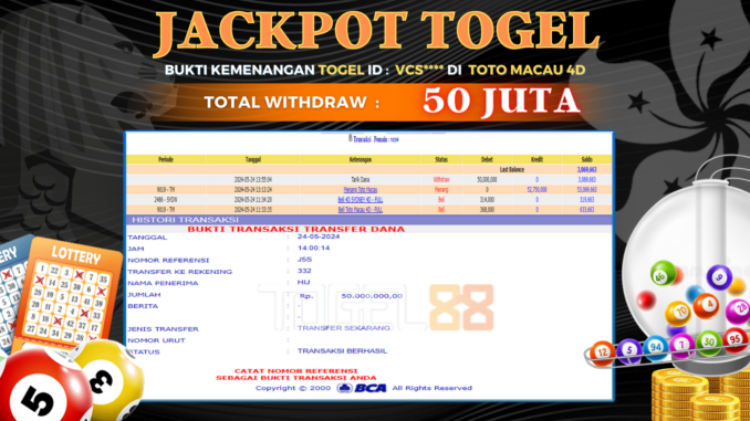 TOGEL88 JACKPOT TOGEL DI TOTO MACAU 4D Rp 50.000.000,- LUNAS