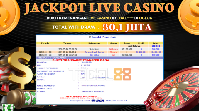MEMBER TOGEL88 MENERIMA PELUNASAN KEMENANGAN JACKPOT LIVE CASINO DI OGLOK Rp 30.100.000,- LUNAS