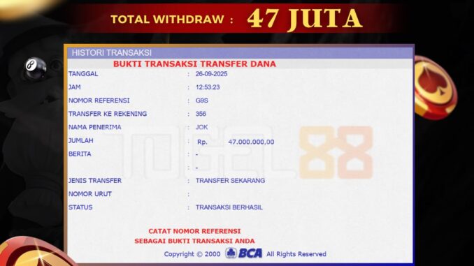 TOGEL88 mengucapkan selamat kepada user id : JOK*** yang telah berhasil mendapatkan jackpot pada permainan LIVE CASINO DI DRAGON TIGER. Kemenangan sebesar Rp 47.000.000,-. telah dibayarkan LUNAS oleh pihak TOGEL88 kepada pemilik user id setelah yang bersangkutan mengisi formulir withdraw. Proses pencairan dana berlangsung sangat cepat hanya dalam waktu 5-10 menit sudah berada dalam rekening pemilik user id. Bukti transfer yang dapat anda lihat adalah bukti SAH / VALID yang langsung di dapatkan melalui bukti transaksi dari Bank yang digunakan untuk pengiriman dana pada rekening pemilik user id. Terima kasih kami sampaikan kepada para pengguna setia TOGEL88 yang telah menggunakan situs kami, sebagai Bandar Terpercaya yang pastinya membayar semua kemenangan member hingga lunas. Apakah TOGEL88 PENIPU ? Reputasi “TOGEL88 TERPERCAYA” sudah sangat melekat. puluhan hingga ratusan ribu pengguna setia TOGEL88 tetap menggunakan situs terbesar dan terbaik di Indonesia ini. Hapus rasa was-was dan khawatir anda, kemenangan anda berapapun PASTI dibayarkan hingga lunas.