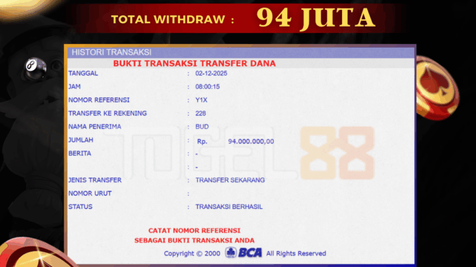 TOGEL88 mengucapkan selamat kepada user id : BUD*** yang telah berhasil mendapatkan jackpot pada permainan LIVE CASINO DI 24D JACKPOT . Kemenangan sebesar Rp 94.000.000,-. telah dibayarkan LUNAS oleh pihak TOGEL88 kepada pemilik user id setelah yang bersangkutan mengisi formulir withdraw. Proses pencairan dana berlangsung sangat cepat hanya dalam waktu 5-10 menit sudah berada dalam rekening pemilik user id. Bukti transfer yang dapat anda lihat adalah bukti SAH / VALID yang langsung di dapatkan melalui bukti transaksi dari Bank yang digunakan untuk pengiriman dana pada rekening pemilik user id. Terima kasih kami sampaikan kepada para pengguna setia TOGEL88 yang telah menggunakan situs kami, sebagai Bandar Terpercaya yang pastinya membayar semua kemenangan member hingga lunas. Apakah TOGEL88 PENIPU ? Reputasi “TOGEL88 TERPERCAYA” sudah sangat melekat. puluhan hingga ratusan ribu pengguna setia TOGEL88 tetap menggunakan situs terbesar dan terbaik di Indonesia ini. Hapus rasa was-was dan khawatir anda, kemenangan anda berapapun PASTI dibayarkan hingga lunas.