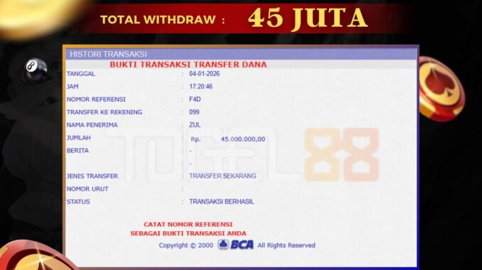 TOGEL88 mengucapkan selamat kepada user id : SEL*** yang telah berhasil mendapatkan jackpot pada permainan LIVE CASINO DI 24D JACKPOT . Kemenangan sebesar Rp 45.000.000,-. telah dibayarkan LUNAS oleh pihak TOGEL88 kepada pemilik user id setelah yang bersangkutan mengisi formulir withdraw. Proses pencairan dana berlangsung sangat cepat hanya dalam waktu 5-10 menit sudah berada dalam rekening pemilik user id. Bukti transfer yang dapat anda lihat adalah bukti SAH / VALID yang langsung di dapatkan melalui bukti transaksi dari Bank yang digunakan untuk pengiriman dana pada rekening pemilik user id. Terima kasih kami sampaikan kepada para pengguna setia TOGEL88 yang telah menggunakan situs kami, sebagai Bandar Terpercaya yang pastinya membayar semua kemenangan member hingga lunas. Apakah TOGEL88 PENIPU ? Reputasi “TOGEL88 TERPERCAYA” sudah sangat melekat. puluhan hingga ratusan ribu pengguna setia TOGEL88 tetap menggunakan situs terbesar dan terbaik di Indonesia ini. Hapus rasa was-was dan khawatir anda, kemenangan anda berapapun PASTI dibayarkan hingga lunas.