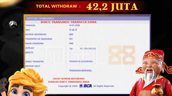 TOGEL88 mengucapkan selamat kepada user id : YAN*** yang telah berhasil mendapatkan jackpot pada permainan SLOT DI WILD BANDITO. Kemenangan sebesar Rp 42.200.000,-. telah dibayarkan LUNAS oleh pihak TOGEL88 kepada pemilik user id setelah yang bersangkutan mengisi formulir withdraw. Proses pencairan dana berlangsung sangat cepat hanya dalam waktu 5-10 menit sudah berada dalam rekening pemilik user id. Bukti transfer yang dapat anda lihat adalah bukti SAH / VALID yang langsung di dapatkan melalui bukti transaksi dari Bank yang digunakan untuk pengiriman dana pada rekening pemilik user id. Terima kasih kami sampaikan kepada para pengguna setia TOGEL88 yang telah menggunakan situs kami, sebagai Bandar Terpercaya yang pastinya membayar semua kemenangan member hingga lunas. Apakah TOGEL88 PENIPU ? Reputasi “TOGEL88 TERPERCAYA” sudah sangat melekat. puluhan hingga ratusan ribu pengguna setia TOGEL88 tetap menggunakan situs terbesar dan terbaik di Indonesia ini. Hapus rasa was-was dan khawatir anda, kemenangan anda berapapun PASTI dibayarkan hingga lunas.