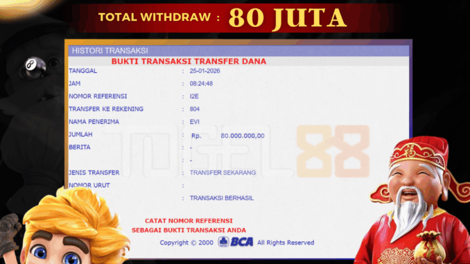 TOGEL88 mengucapkan selamat kepada user id : TAS*** yang telah berhasil mendapatkan jackpot pada permainan SLOT DI KOI GATE. Kemenangan sebesar Rp 80.000.000,-. telah dibayarkan LUNAS oleh pihak TOGEL88 kepada pemilik user id setelah yang bersangkutan mengisi formulir withdraw. Proses pencairan dana berlangsung sangat cepat hanya dalam waktu 5-10 menit sudah berada dalam rekening pemilik user id. Bukti transfer yang dapat anda lihat adalah bukti SAH / VALID yang langsung di dapatkan melalui bukti transaksi dari Bank yang digunakan untuk pengiriman dana pada rekening pemilik user id. Terima kasih kami sampaikan kepada para pengguna setia TOGEL88 yang telah menggunakan situs kami, sebagai Bandar Terpercaya yang pastinya membayar semua kemenangan member hingga lunas. Apakah TOGEL88 PENIPU ? Reputasi “TOGEL88 TERPERCAYA” sudah sangat melekat. puluhan hingga ratusan ribu pengguna setia TOGEL88 tetap menggunakan situs terbesar dan terbaik di Indonesia ini. Hapus rasa was-was dan khawatir anda, kemenangan anda berapapun PASTI dibayarkan hingga lunas.