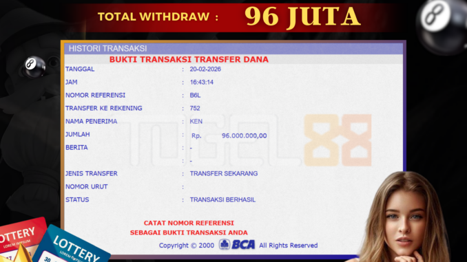TOGEL88 mengucapkan selamat kepada user id : KEN*** yang telah berhasil mendapatkan jackpot pada permainan TOGEL DI SYDNEY LOTTO. Kemenangan sebesar Rp 96.000.000,-. telah dibayarkan LUNAS oleh pihak TOGEL88 kepada pemilik user id setelah yang bersangkutan mengisi formulir withdraw. Proses pencairan dana berlangsung sangat cepat hanya dalam waktu 5-10 menit sudah berada dalam rekening pemilik user id. Bukti transfer yang dapat anda lihat adalah bukti SAH / VALID yang langsung di dapatkan melalui bukti transaksi dari Bank yang digunakan untuk pengiriman dana pada rekening pemilik user id. Terima kasih kami sampaikan kepada para pengguna setia TOGEL88 yang telah menggunakan situs kami, sebagai Bandar Terpercaya yang pastinya membayar semua kemenangan member hingga lunas. Apakah TOGEL88 PENIPU ? Reputasi “TOGEL88 TERPERCAYA” sudah sangat melekat. puluhan hingga ratusan ribu pengguna setia TOGEL88 tetap menggunakan situs terbesar dan terbaik di Indonesia ini. Hapus rasa was-was dan khawatir anda, kemenangan anda berapapun PASTI dibayarkan hingga lunas.