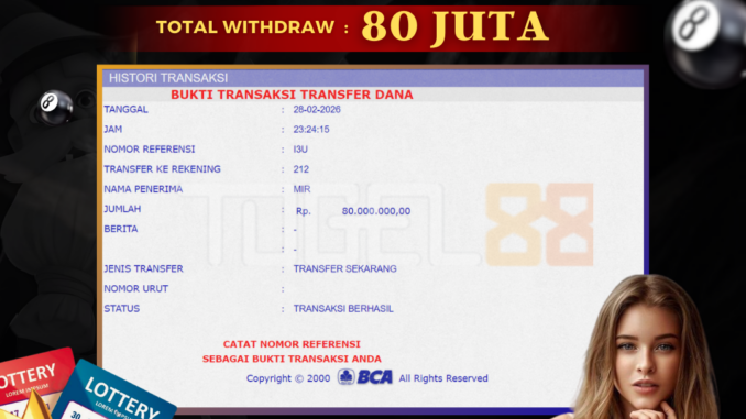 TOGEL88 mengucapkan selamat kepada user id : SIT*** yang telah berhasil mendapatkan jackpot pada permainan TOGEL DI HONGKONG LOTTO. Kemenangan sebesar Rp 80.000.000,-. telah dibayarkan LUNAS oleh pihak TOGEL88 kepada pemilik user id setelah yang bersangkutan mengisi formulir withdraw. Proses pencairan dana berlangsung sangat cepat hanya dalam waktu 5-10 menit sudah berada dalam rekening pemilik user id. Bukti transfer yang dapat anda lihat adalah bukti SAH / VALID yang langsung di dapatkan melalui bukti transaksi dari Bank yang digunakan untuk pengiriman dana pada rekening pemilik user id. Terima kasih kami sampaikan kepada para pengguna setia TOGEL88 yang telah menggunakan situs kami, sebagai Bandar Terpercaya yang pastinya membayar semua kemenangan member hingga lunas. Apakah TOGEL88 PENIPU ? Reputasi “TOGEL88 TERPERCAYA” sudah sangat melekat. puluhan hingga ratusan ribu pengguna setia TOGEL88 tetap menggunakan situs terbesar dan terbaik di Indonesia ini. Hapus rasa was-was dan khawatir anda, kemenangan anda berapapun PASTI dibayarkan hingga lunas.