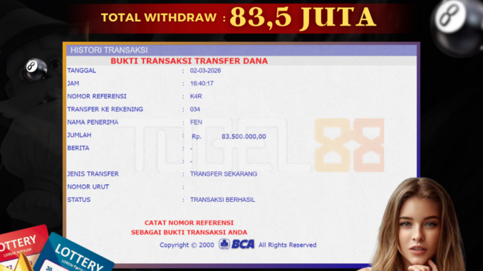 TOGEL88 mengucapkan selamat kepada user id : NAN*** yang telah berhasil mendapatkan jackpot pada permainan TOGEL DI SYDNEY LOTTO. Kemenangan sebesar Rp 83.500.000,-. telah dibayarkan LUNAS oleh pihak TOGEL88 kepada pemilik user id setelah yang bersangkutan mengisi formulir withdraw. Proses pencairan dana berlangsung sangat cepat hanya dalam waktu 5-10 menit sudah berada dalam rekening pemilik user id. Bukti transfer yang dapat anda lihat adalah bukti SAH / VALID yang langsung di dapatkan melalui bukti transaksi dari Bank yang digunakan untuk pengiriman dana pada rekening pemilik user id. Terima kasih kami sampaikan kepada para pengguna setia TOGEL88 yang telah menggunakan situs kami, sebagai Bandar Terpercaya yang pastinya membayar semua kemenangan member hingga lunas. Apakah TOGEL88 PENIPU ? Reputasi “TOGEL88 TERPERCAYA” sudah sangat melekat. puluhan hingga ratusan ribu pengguna setia TOGEL88 tetap menggunakan situs terbesar dan terbaik di Indonesia ini. Hapus rasa was-was dan khawatir anda, kemenangan anda berapapun PASTI dibayarkan hingga lunas.