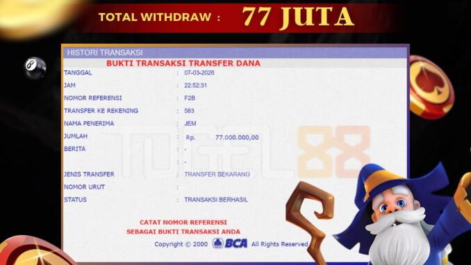 TOGEL88 mengucapkan selamat kepada user id : TAR*** yang telah berhasil mendapatkan jackpot pada permainan LIVE CASINO DI ROULETTE . Kemenangan sebesar Rp 77.000.000,-. telah dibayarkan LUNAS oleh pihak TOGEL88 kepada pemilik user id setelah yang bersangkutan mengisi formulir withdraw. Proses pencairan dana berlangsung sangat cepat hanya dalam waktu 5-10 menit sudah berada dalam rekening pemilik user id. Bukti transfer yang dapat anda lihat adalah bukti SAH / VALID yang langsung di dapatkan melalui bukti transaksi dari Bank yang digunakan untuk pengiriman dana pada rekening pemilik user id. Terima kasih kami sampaikan kepada para pengguna setia TOGEL88 yang telah menggunakan situs kami, sebagai Bandar Terpercaya yang pastinya membayar semua kemenangan member hingga lunas. Apakah TOGEL88 PENIPU ? Reputasi “TOGEL88 TERPERCAYA” sudah sangat melekat. puluhan hingga ratusan ribu pengguna setia TOGEL88 tetap menggunakan situs terbesar dan terbaik di Indonesia ini. Hapus rasa was-was dan khawatir anda, kemenangan anda berapapun PASTI dibayarkan hingga lunas.