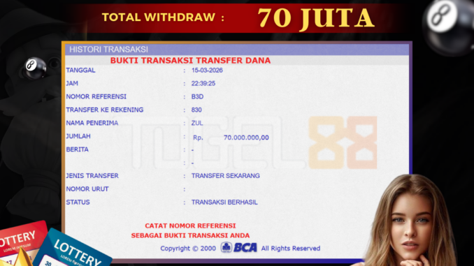 TOGEL88 mengucapkan selamat kepada user id : ZUL*** yang telah berhasil mendapatkan jackpot pada permainan TOGEL DI JOWOPOOLS. Kemenangan sebesar Rp 70.000.000,-. telah dibayarkan LUNAS oleh pihak TOGEL88 kepada pemilik user id setelah yang bersangkutan mengisi formulir withdraw. Proses pencairan dana berlangsung sangat cepat hanya dalam waktu 5-10 menit sudah berada dalam rekening pemilik user id. Bukti transfer yang dapat anda lihat adalah bukti SAH / VALID yang langsung di dapatkan melalui bukti transaksi dari Bank yang digunakan untuk pengiriman dana pada rekening pemilik user id. Terima kasih kami sampaikan kepada para pengguna setia TOGEL88 yang telah menggunakan situs kami, sebagai Bandar Terpercaya yang pastinya membayar semua kemenangan member hingga lunas. Apakah TOGEL88 PENIPU ? Reputasi “TOGEL88 TERPERCAYA” sudah sangat melekat. puluhan hingga ratusan ribu pengguna setia TOGEL88 tetap menggunakan situs terbesar dan terbaik di Indonesia ini. Hapus rasa was-was dan khawatir anda, kemenangan anda berapapun PASTI dibayarkan hingga lunas.