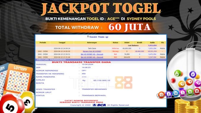 TOGEL88 JACKPOT TOGEL DI SYDNEY POOLS Rp 60.000.000,- LUNAS