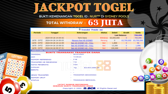 TOGEL88 mengucapkan selamat kepada user id : NUR*** yang telah berhasil mendapatkan jackpot pada permainan TOGEL DI SYDNEY POOLS. Kemenangan sebesar Rp 63.000.000,-. telah dibayarkan LUNAS oleh pihak TOGEL88 kepada pemilik user id setelah yang bersangkutan mengisi formulir withdraw. Proses pencairan dana berlangsung sangat cepat hanya dalam waktu 5-10 menit sudah berada dalam rekening pemilik user id. Bukti transfer yang dapat anda lihat adalah bukti SAH / VALID yang langsung di dapatkan melalui bukti transaksi dari Bank yang digunakan untuk pengiriman dana pada rekening pemilik user id. Terima kasih kami sampaikan kepada para pengguna setia TOGEL88 yang telah menggunakan situs kami, sebagai Bandar Terpercaya yang pastinya membayar semua kemenangan member hingga lunas. Apakah TOGEL88 PENIPU ? Reputasi “TOGEL88 TERPERCAYA” sudah sangat melekat. puluhan hingga ratusan ribu pengguna setia TOGEL88 tetap menggunakan situs terbesar dan terbaik di Indonesia ini. Hapus rasa was-was dan khawatir anda, kemenangan anda berapapun PASTI dibayarkan hingga lunas.