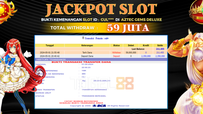 TOGEL88 mengucapkan selamat kepada user id : CUL*** yang telah berhasil mendapatkan jackpot pada permainan SLOT DI AZTEC GEMS DELUXE. Kemenangan sebesar Rp 59.000.000,-. telah dibayarkan LUNAS oleh pihak TOGEL88 kepada pemilik user id setelah yang bersangkutan mengisi formulir withdraw. Proses pencairan dana berlangsung sangat cepat hanya dalam waktu 5-10 menit sudah berada dalam rekening pemilik user id. Bukti transfer yang dapat anda lihat adalah bukti SAH / VALID yang langsung di dapatkan melalui bukti transaksi dari Bank yang digunakan untuk pengiriman dana pada rekening pemilik user id. Terima kasih kami sampaikan kepada para pengguna setia TOGEL88 yang telah menggunakan situs kami, sebagai Bandar Terpercaya yang pastinya membayar semua kemenangan member hingga lunas. Apakah TOGEL88 PENIPU ? Reputasi “TOGEL88 TERPERCAYA” sudah sangat melekat. puluhan hingga ratusan ribu pengguna setia TOGEL88 tetap menggunakan situs terbesar dan terbaik di Indonesia ini. Hapus rasa was-was dan khawatir anda, kemenangan anda berapapun PASTI dibayarkan hingga lunas.