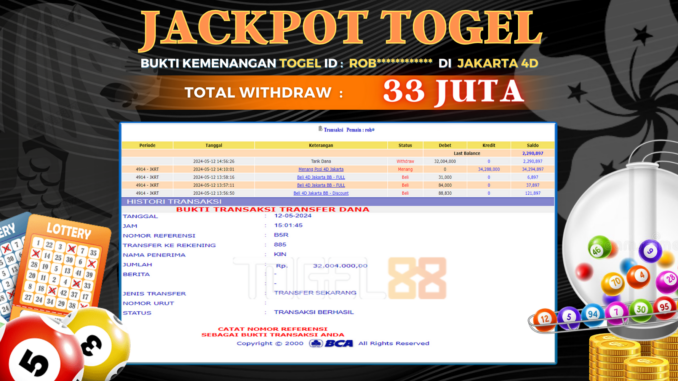 TOGEL88 JACKPOT TOGEL DI JAKARTA 4D Rp 33.000.000,- LUNAS