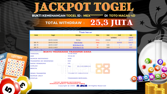 TOGEL88 JACKPOT TOGEL DI TOTO MACAU 4D Rp 25.300.000,- LUNAS