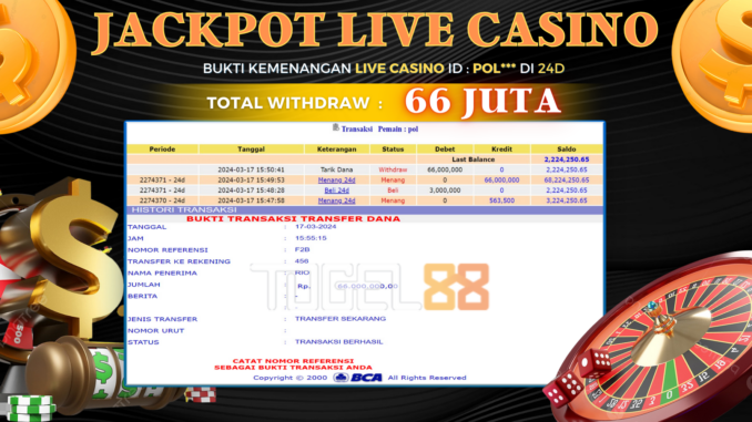 TOGEL88 JACKPOT LIVE CASINO DI 24D Rp 66.000.000,- LUNAS